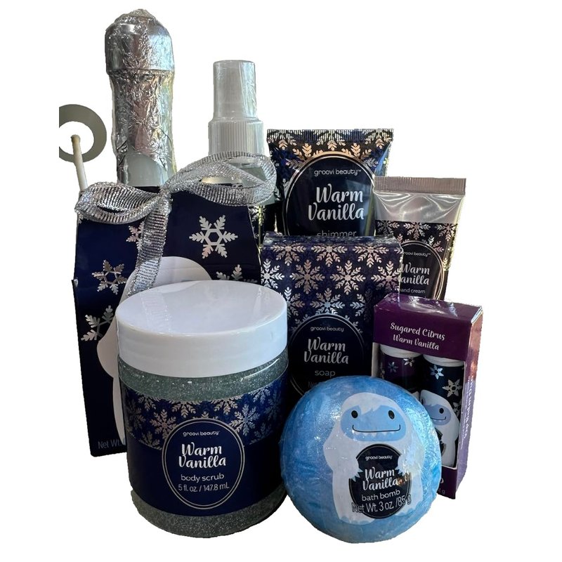Groovy 9 Piece Bath & Body Self Care Pack in Warm Vanilla Includes Bubble Bath, Shimmer Body Mist, Shimmer Body Lotion, Bath Confetti, Body Scrub, Lip Balm Duo, Bath Bomb, Hand Cream, Soap