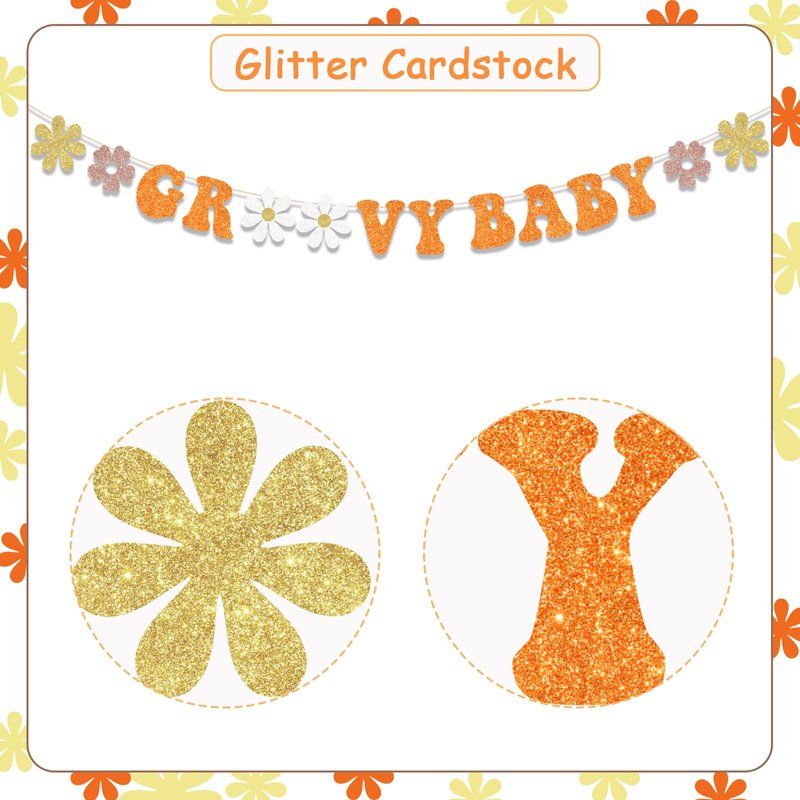 - Material: Groovy baby banner is made of glitter cardstock. It’s a shiny addition for groovy baby shower.