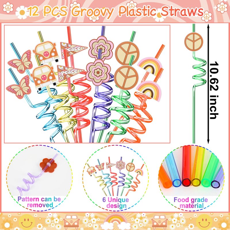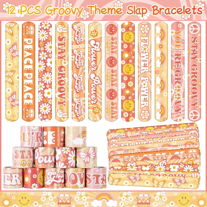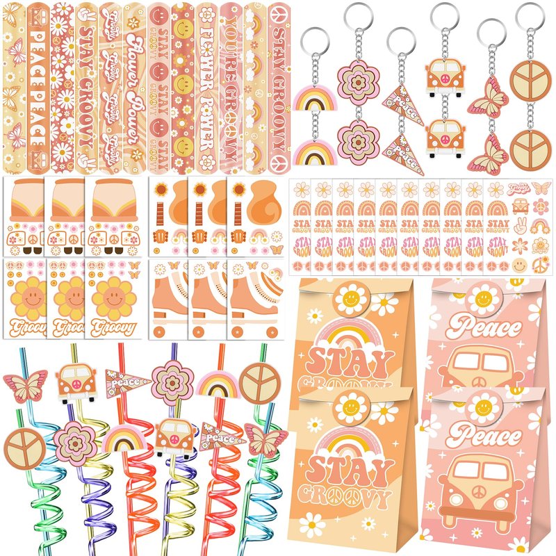 - PACKAGE INCLUDE - Groovy party favors includes 12 PCS Slap Bracelets(12 styles), 12 PCS DIY Stickers(4 styles), 12 PCS Temporary Tattoos, 12 PCS Keychains(6 styles), 12 PCS Plastic Straws(6 styles) and 12 PCS Gift Bags(2 styles). Enough quantity to meet your party need.