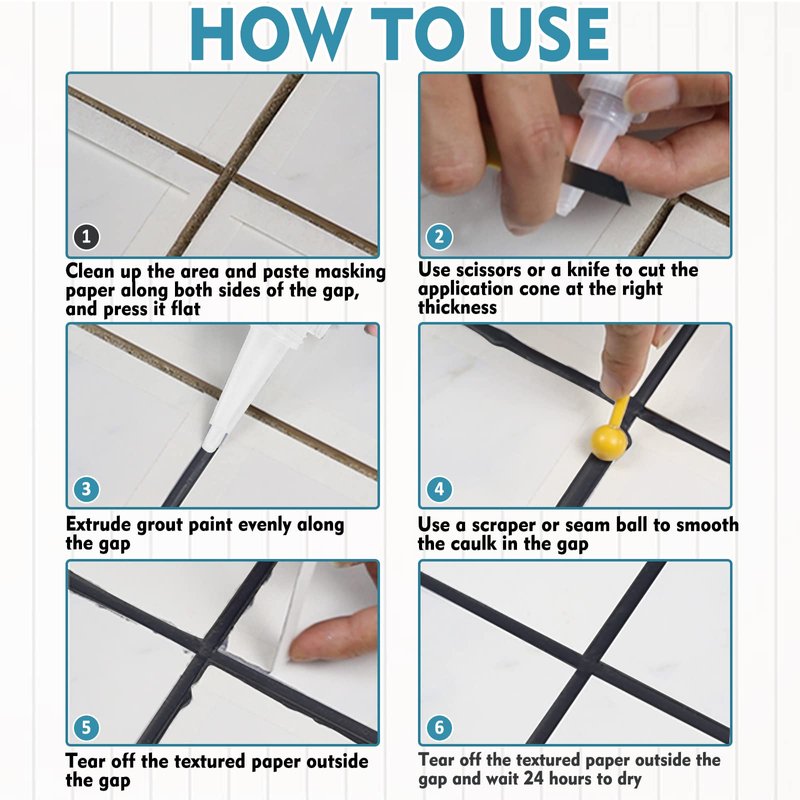 - Easy To Use: Our grout sealer is simple to make your DIY effort look like a professional result. 1. Keep the area around the gap dry completely. 2. Paste the stickers along both sides of the gap, and press it flat. 3. Unscrew the cap and cut the tip at the right thickness so it corresponds with the width of the grout. 4. Extrude grout paint evenly along the gap. 5. Use a scraper or small stick to smooth the caulk in the gap. 6. Tear off the stickers outside the gap and wait 24 hours to dry.