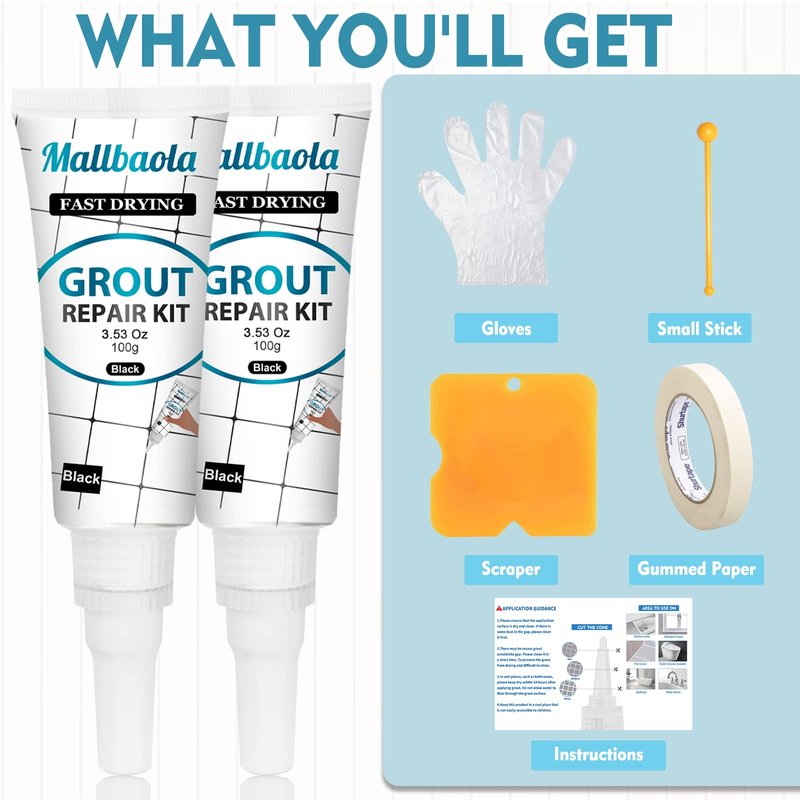 - Complete Kit: 2 pack black grout repair kits, a scraper, a roll of stickers, a small stick, two pairs of gloves, an instruction and a box. Approximate coverage is 50 - 300 feet, depending on tile size and grout joint width. Getting a professional quality tile grout repair kit to restore and renew grout lines has never been so easy.