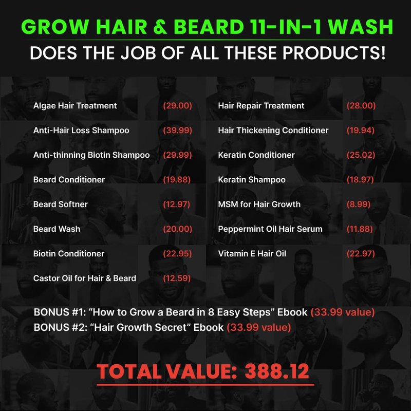 - THERE'S MORE... GROW 11-in-1 hair and beard shampoo for men & hair thickening conditioner is also a beard exfoliator, beard scrub, beard detangler for men, and beard conditioner for men. GROW 11-in-1 biotin shampoo for hair growth & beard softener for men makes hair grow fast! The anti-hair loss formula protects your hair follicles and, when it comes to facial hair growth for men, is one of the best things to make your beard grow faster, softer, fuller, thicker, and more supple than ever before!