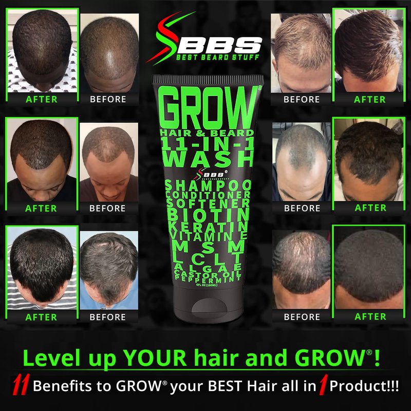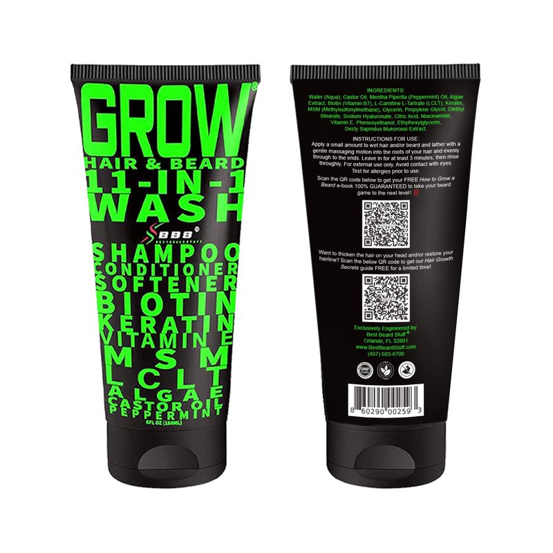 GROW Hair & Beard 11-in-1 Wash: Shampoo, Conditioner Softener, Biotin, Castor Oil, Peppermint Essential Oil, Vitamin E, MSM, Keratin, Algae, LCLT - Supports Healthy Growth - Vegan - BBS USA Product