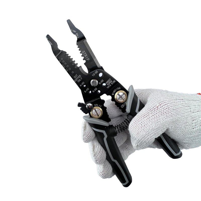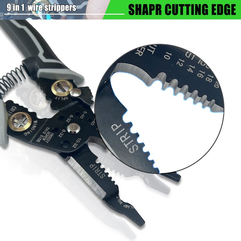 - 【All-in-one wire stripping tool】This heavy-duty 9-in-1 pliers features a wire stripper, wire cutter, reamer, splitter, winder, bolt cutter, and crimper. Wire stripper pliers have six stripping holes for 10-20 AWG stranded and solid wire.