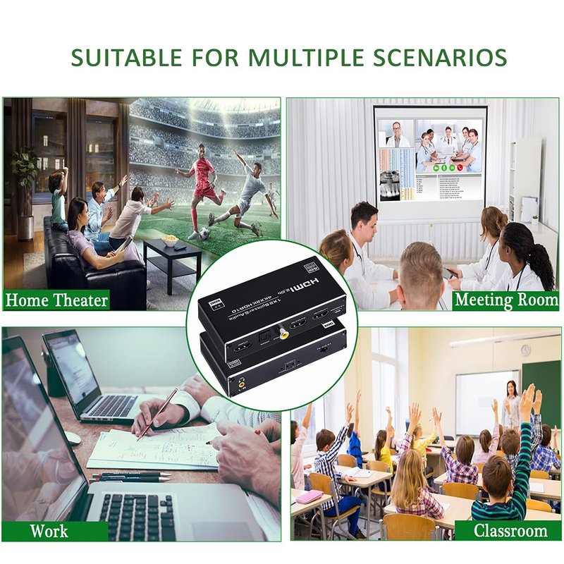 - HDMI Splitter 1 In 2 Out: The HDMI Splitter 1 in 2 Out allows distributes 1 HDMI source to two HDMI displays simultaneously and extract audio signals, And Extract HDMI Audio to 3.5mm Audio jack + Coaxial + SPDIF Audio Port. And then display it on two HDMI displays simultaneously without any loss, lag, flash or drop in resolution. (Note: It is not a HDMI switch, can only duplicate the screen to dual monitors)