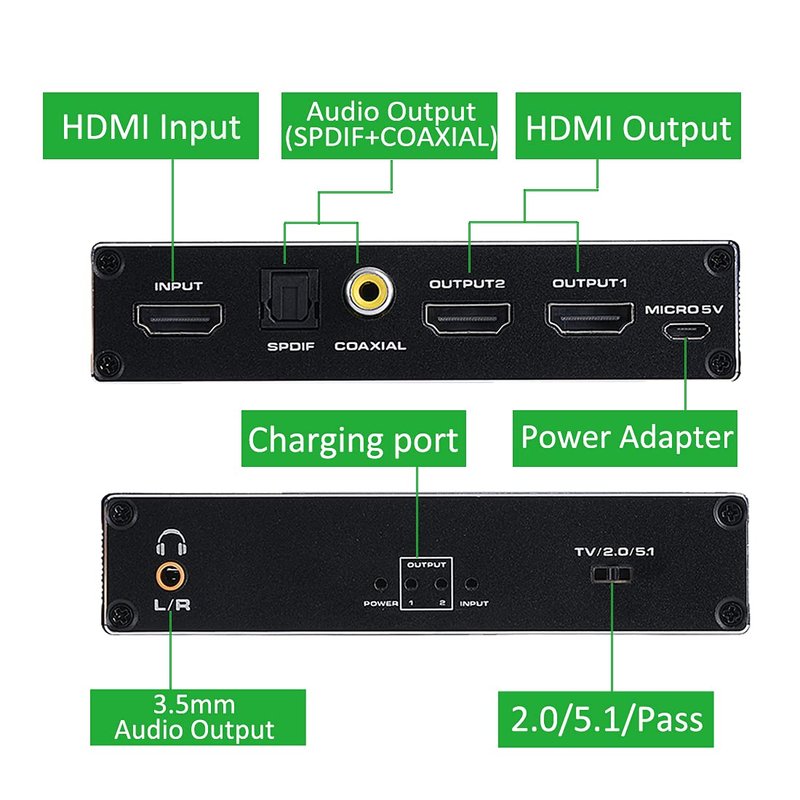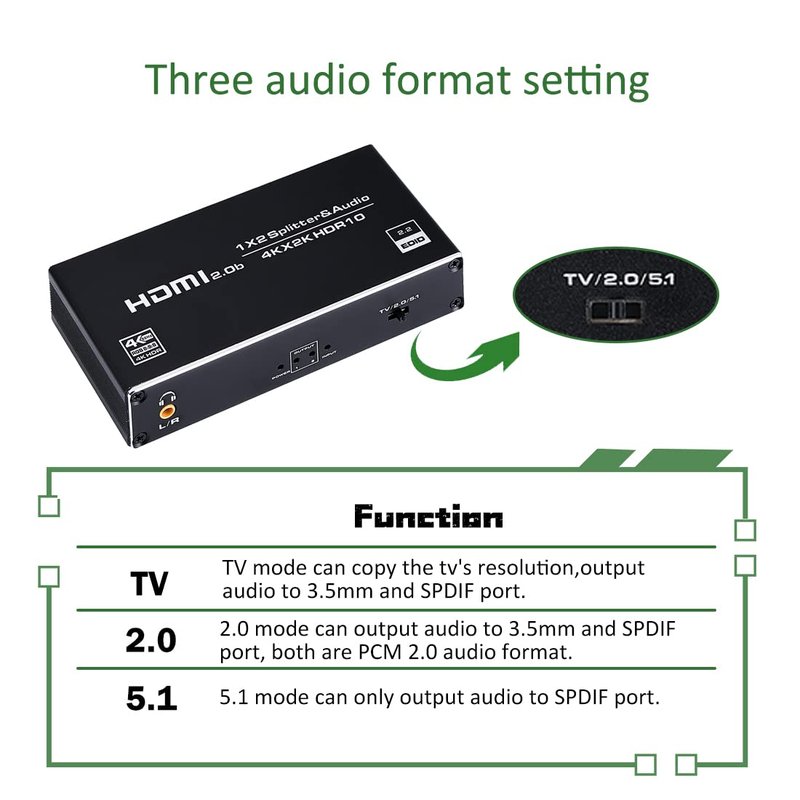 - Three audio settings: This HDMI audio extractor extracts audio signal from HDMI signal soure and converts it to Optical Toslink SPDIF and Coaxial or 3.5mm audio out. Set the audio format you need by switching the buttons TV/2.0/5.1. →TV mode can copy the TV's resolution,output audio to 3.5mm and SPDIF port; →2.0 mode can output audio to 3.5mm and SPDIF port, both are PCM 2.0 audio format; →5.1 mode can only output audio to SPDIF port.