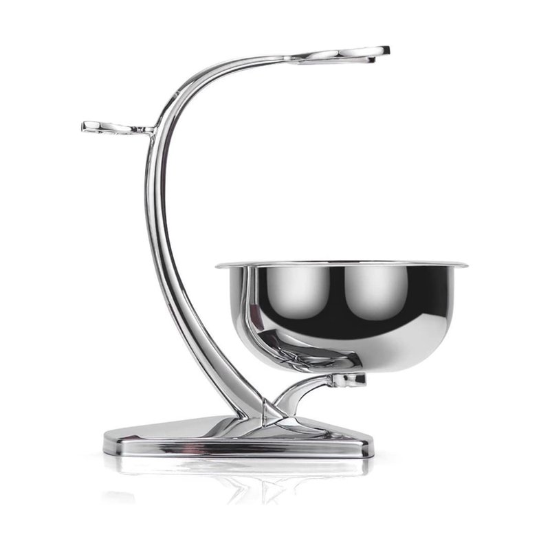 The soap bowl is made of stainless steel, and the shaving brush razor stand is a chrome bracket.