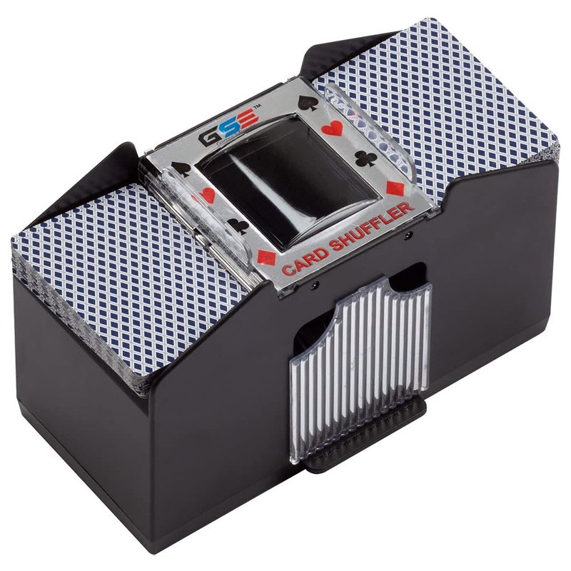 - 1-4 DECK AUTOMATIC CARD SHUFFLER – This casino card shuffler works with most of card games such as bridge, poker, texas hold 'em, blackjack, casino poker games, UNO, etc. The card collection tray will effectively shuffle the cards in a few seconds, up to 1-4 decks of cards, only 1-6 seconds, so you can spend less time shuffling and more time playing games.