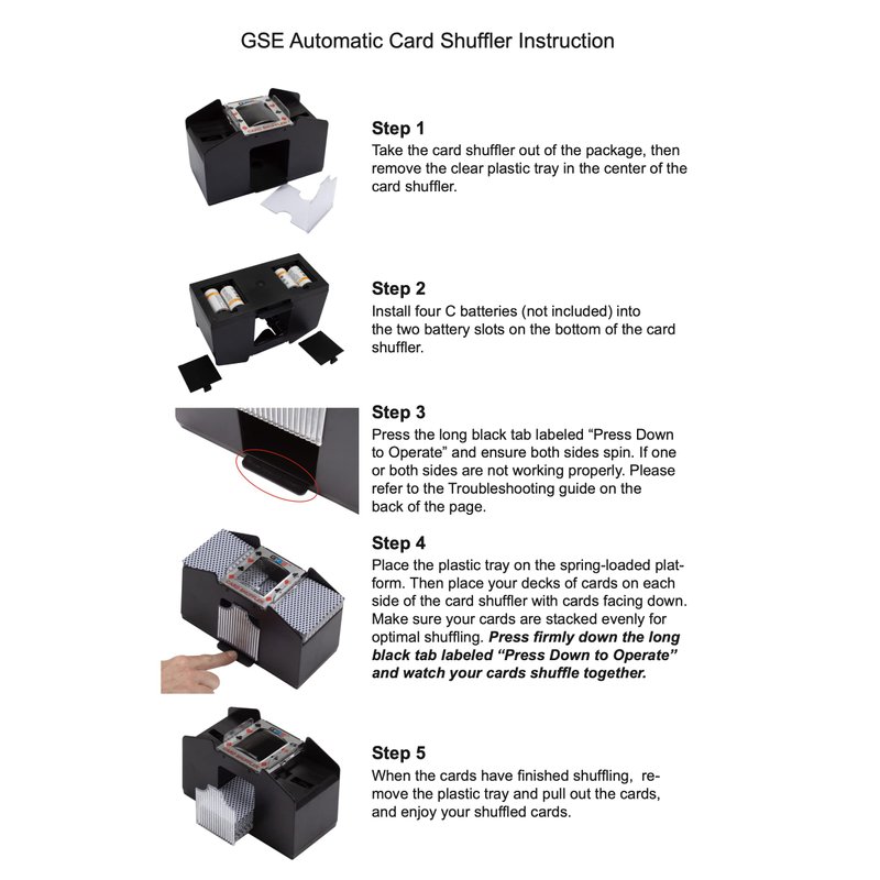 - IMPORTANT TIP - The card shuffler may cause slow or no shuffling based on your frequency of use and battery consumption, but it is not a quality issue. Four brand new C batteries(1.5V) have been shuffled continuously at full load for more than 2 to 3 hours, and the above situation may occur. Please prepare more spare batteries according to the actual condition.