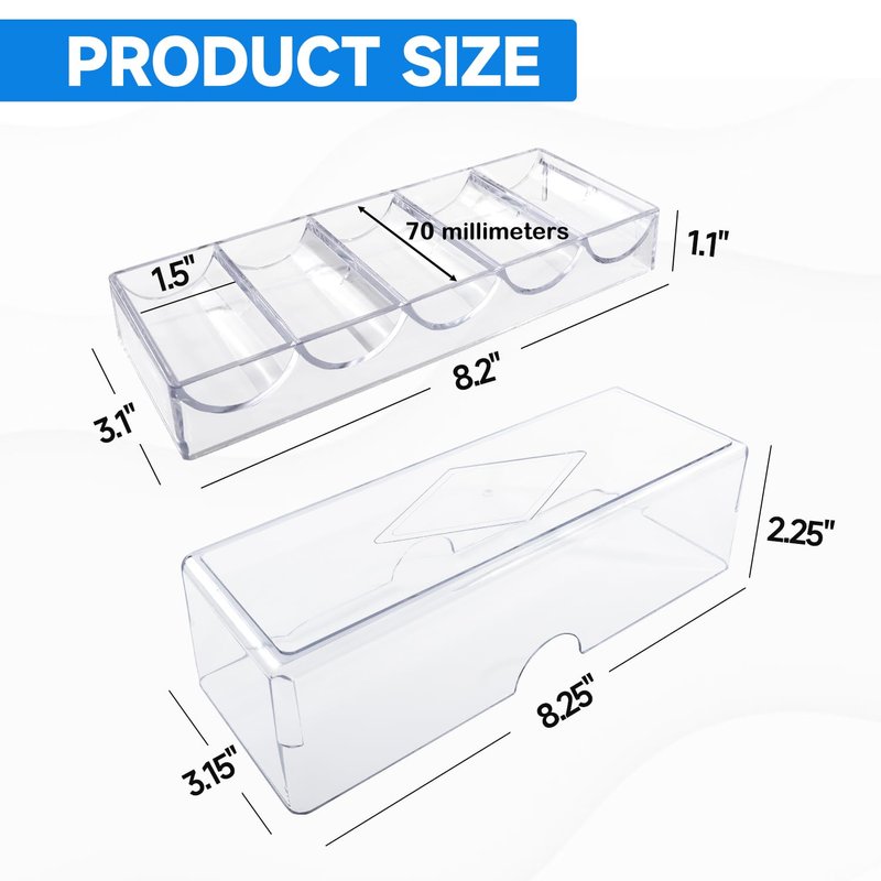 - Chip Rack Size: The poker chip tray dimensions are 8.25" L x 3.15" W x 2.25" H (with cover), the internal width is 70 mm, a perfect fit for chips of any thickness; the poker chip tray rack won't take up too much space, making the desktop keep tidy