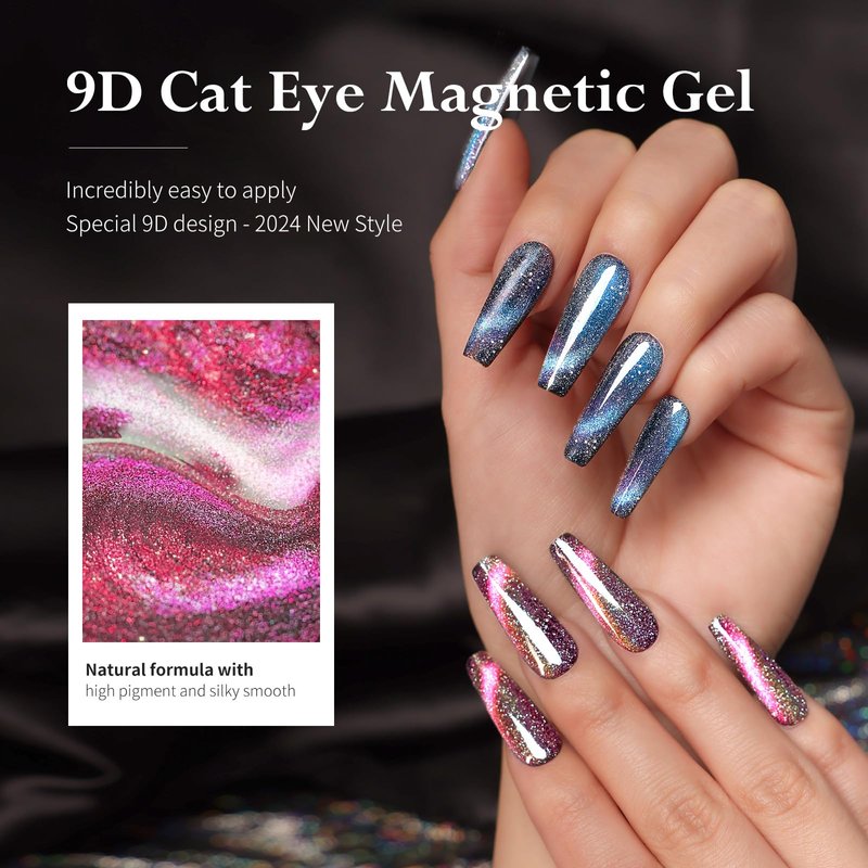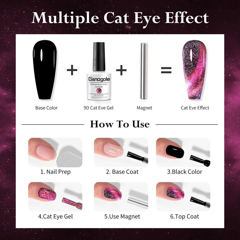 - Multiple Effects: With this 9D Reflective Galaxy Cat Eye Gel, you'll achieve various dreamy cat eye effects such as galaxy hole effect, diagonal line effect, starry sky effect, and more. Watch the colors dance and change in the light, creating captivating and ethereal effects. Explore creativity in nail art with this gel nail polish set.