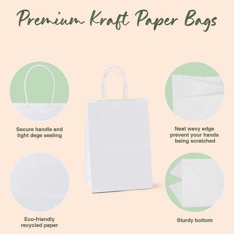 - White Kraft Paper Bags - These Halulu white kraft paper gift bags measure 5.25x3.75x8" inches, pack of 20 bags. Great for merchandise and retail shopping use, party favor bags, or gift bags. Can also be used for food service and take-out. These recycled paper bags are perfect for business or restaurant use, kraft paper bags are a popular choice among many retailers. These all purpose, high quality kraft paper bags are sturdy and easy to load.