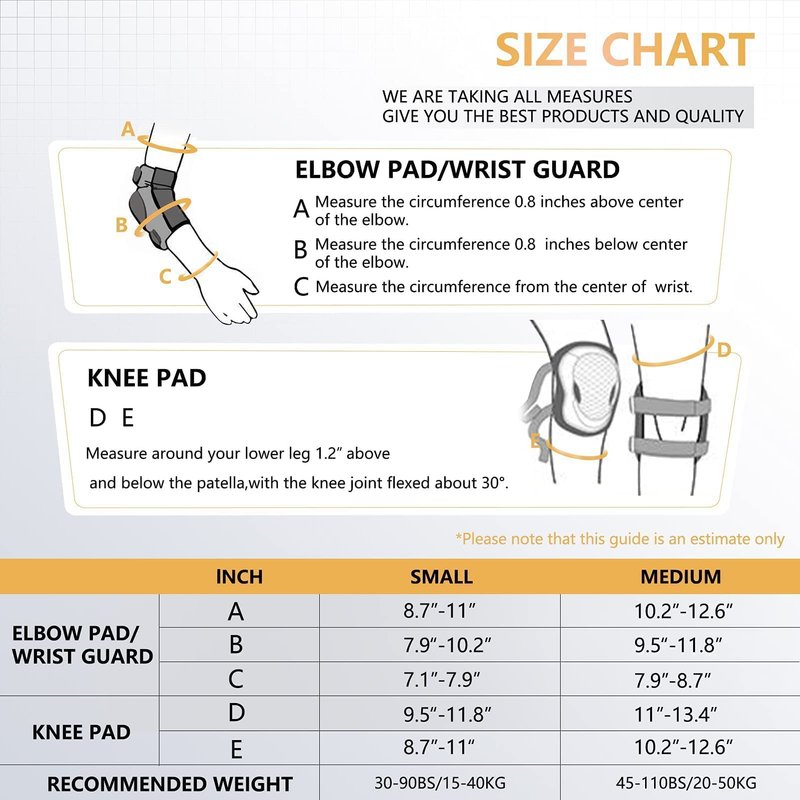 - 🎁6 in 1 Kids Protective Gear Set: Size S fits for 3-8 Years old,15-40kg/ 30-90lbs, Size M fits for 8-12 years old,20-50kg/ 45-110lbs .Can be used for both boys and girls.(Please check the size chart in the detail picture before buying)