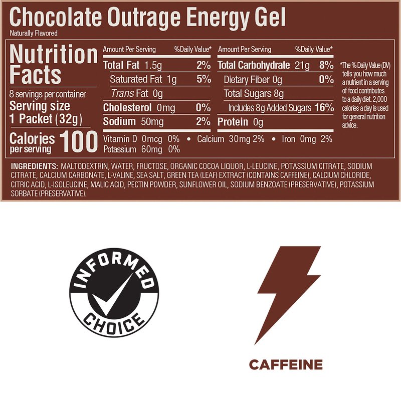- Chocolate Outrage contains 20mg Caffeine, 50mg Sodium, 40mg Potassium. Vegan and Gluten Free.