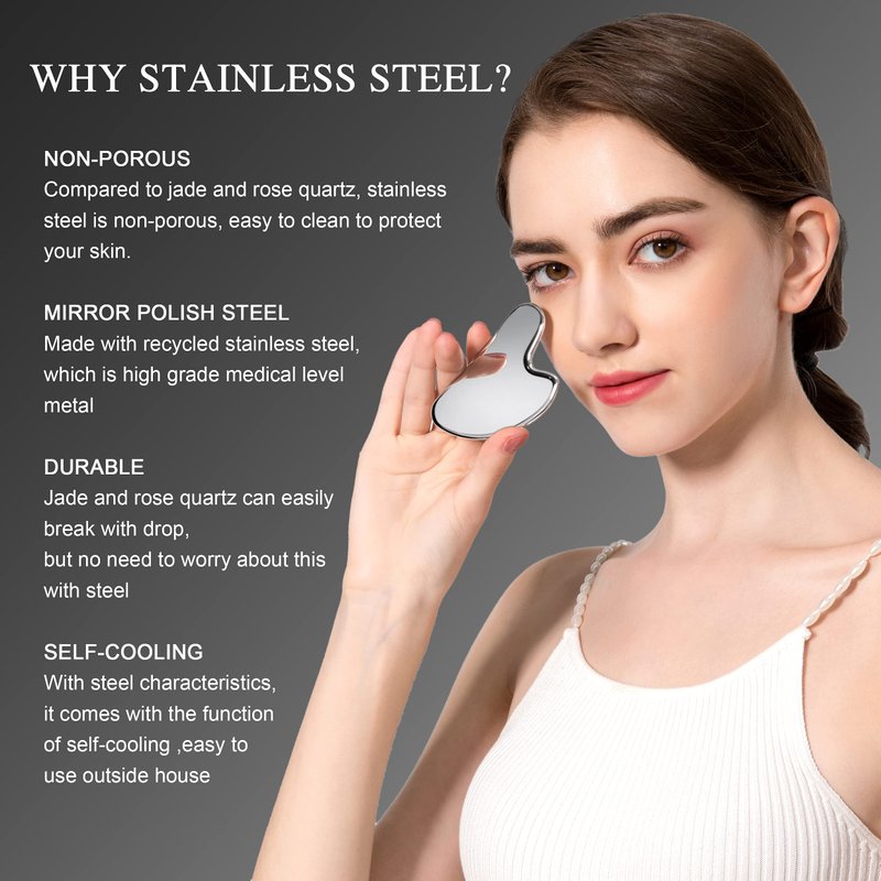 - 【Stainless Steel Material】 Compared to other jade and stone material, this gua sha facial tool is made of mirror finish recycled stainless steel, which is more durable and more easy to clean. More importanly, this steel gua sha tool is non-porous with self-cooling function, convenient for taking along during travel.