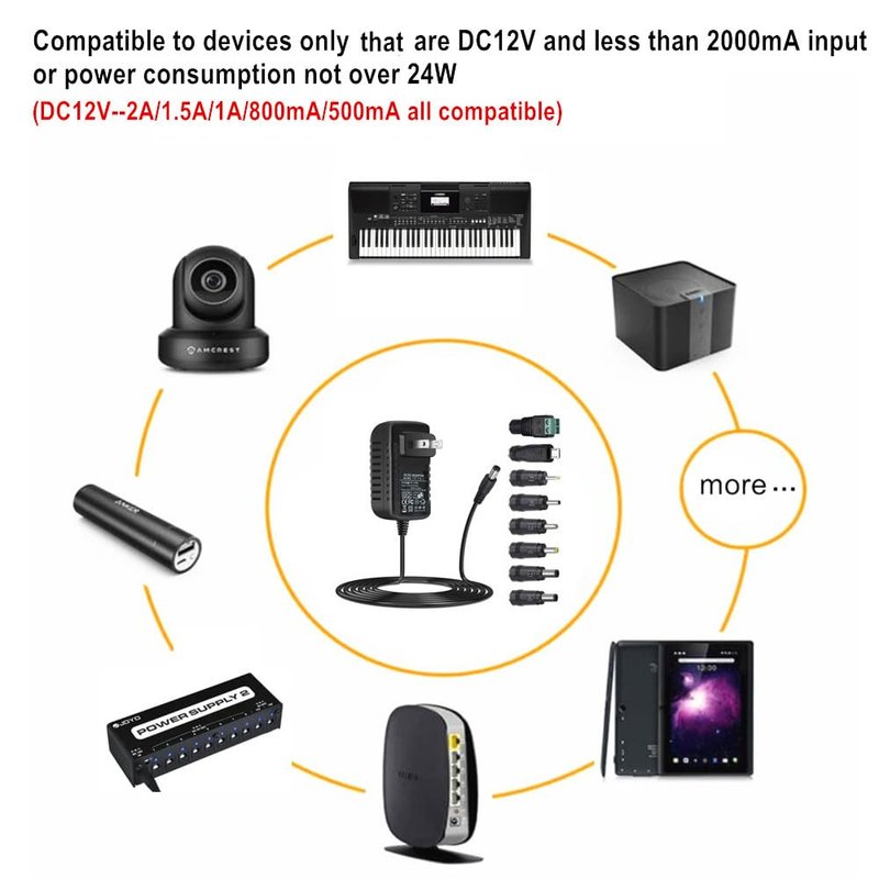 GuanTing Universal AC Adapter 12V 2A Power Supply Charger 24W AC110V to DC12V 2000mA 1500mA 1000mA 500mA Power Driver 8 DC Plug Tips 12 Volt Converter Inverter Transformer ac dc Adapter(DC12V~2A)