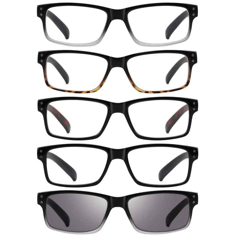 - 5 pairs of men and women reading glasses with colors available: tortoise,black frame with tortoise arms,transparent frame,grey lens,black,black-clear and black-yellow
