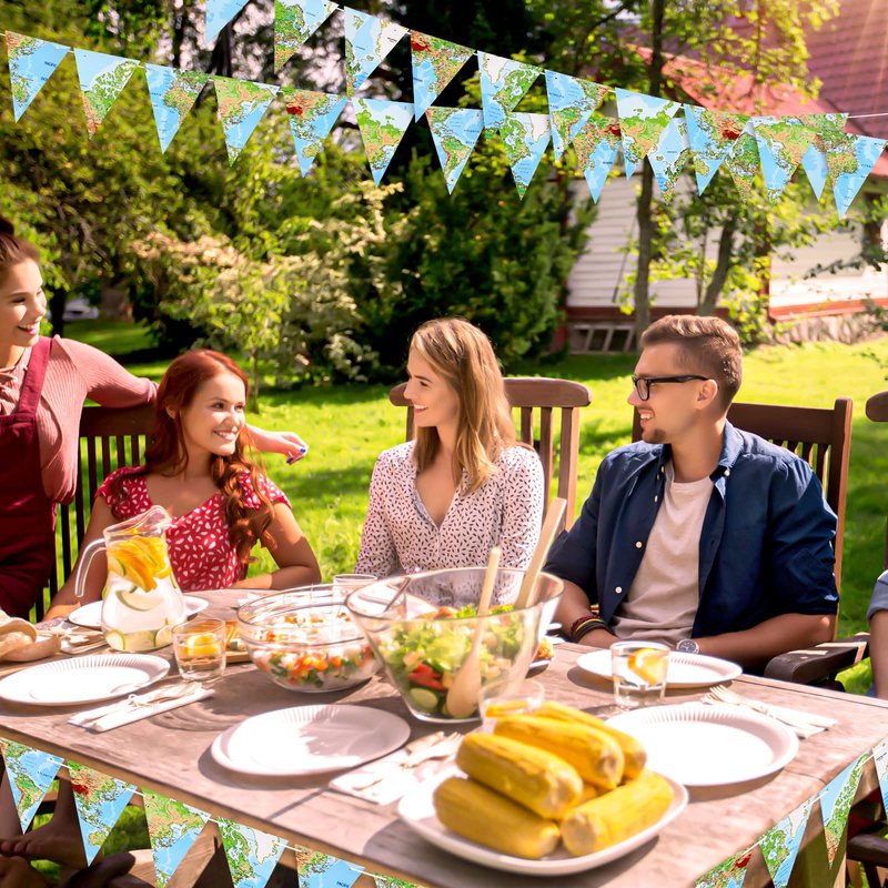 - Vibrant Colors: this travel themed party banner features globes printed on both sides and features bold, eye catching colors and a crisp design; Each flag is full of energy and certain to liven up any celebration