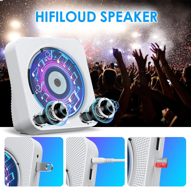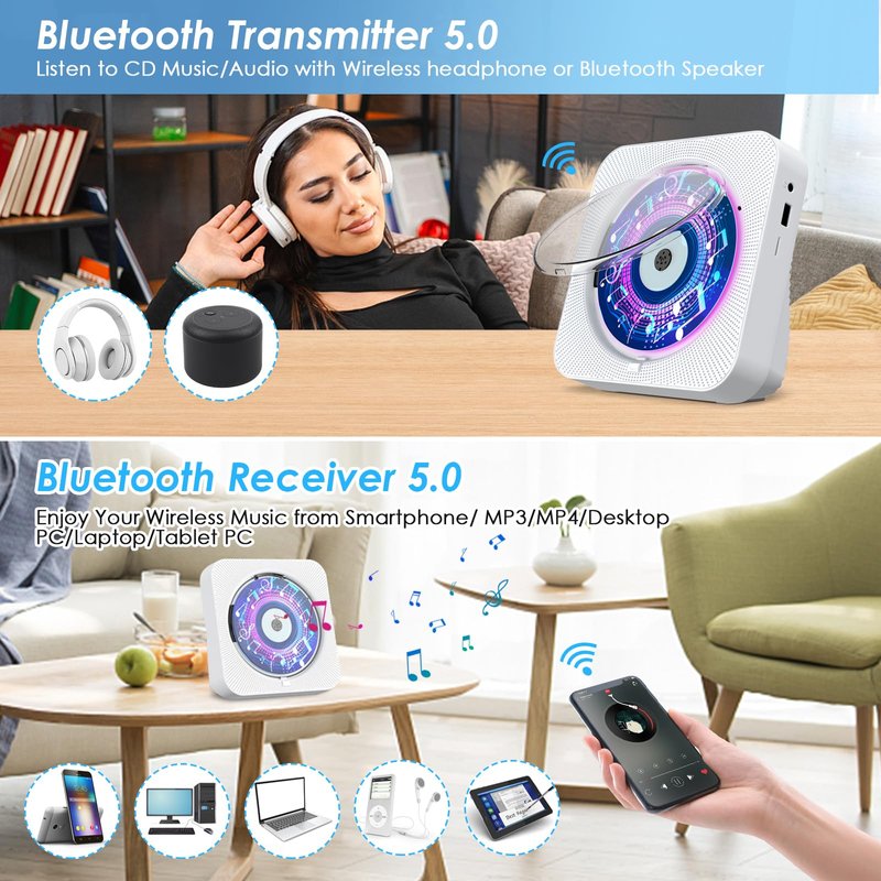 - Dual Bluetooth CD Player: Built-in dual Hi-Fi Bluetooth speakers, which can be connected with Bluetooth-enabled devices such as mobile phone or tablet. It will work as a wired speaker. NOTICE: It's a Bluetooth transmitter and receiver