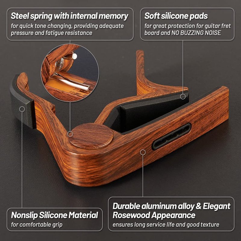 - SUITABLE FOR GUITARS OF 6 STRING - The metal guitar capo, which is compatible with various guitars with u-style, v-style or c-style, is Designed for electric guitar, acoustic guitar, bass, mandolin, ukulele, and banjo to change intervals quickly. The rosewood color stands out on any guitars.