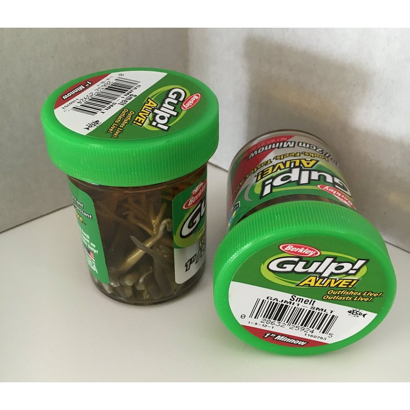 BERKLEY GULP ALIVE 1 INCH SMELT MINNOW 2 jar bundle This PAIR of 2.1 oz. JARS are packed with PLENTY of SMELT MINNOWS for all fishing Berkley Gulp Alive 1INCH SMELT minnows come floating in "MAJIC GRAVY " and they can be RECHARGED by putting them back into the jar Small GULP MINNOWS are perfect for panfish and trout Ice fishermen will want to give these a try Packed in 2.1 oz. jar Model: SGAJMI1SMLT