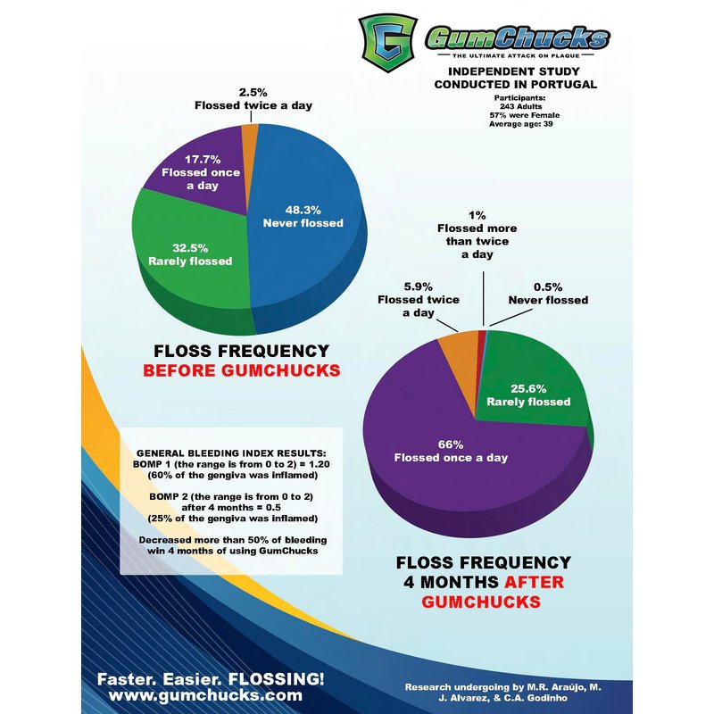 - Tested and Approved: An independent study in Portugal aimed to assess patients’ flossing habits showed that 81% of patients rarely or never flossed. After 4 months of using GumChucks, the number of non-flossers plummeted to 26%, indicating that 74% of patients now flossed at least once a day.