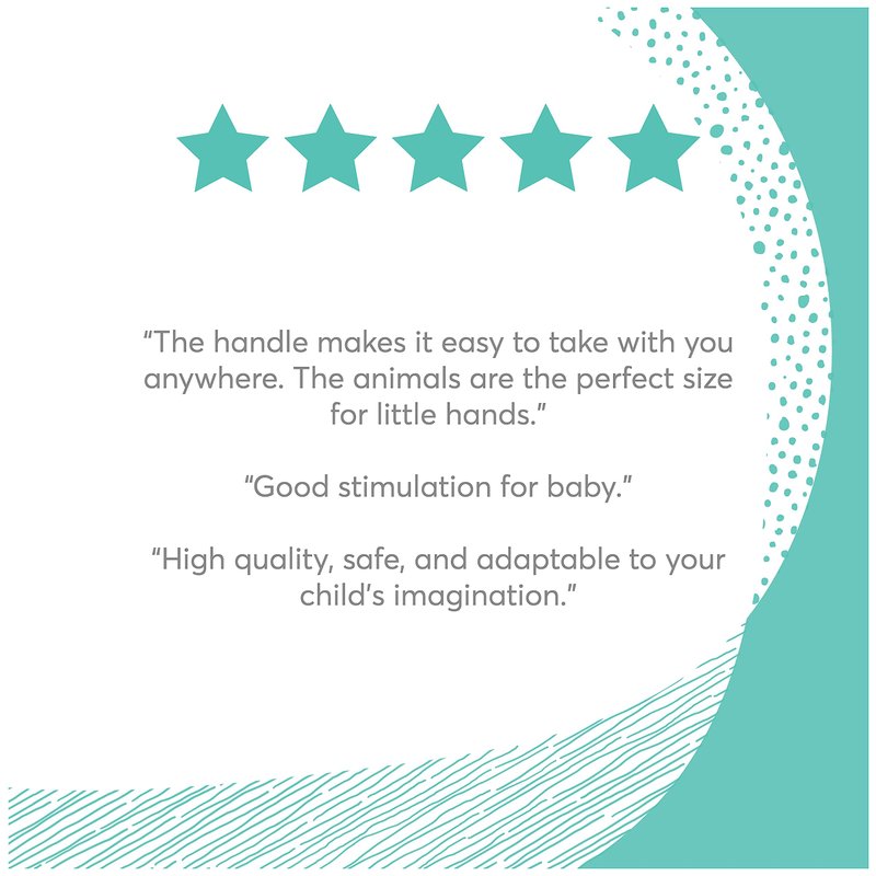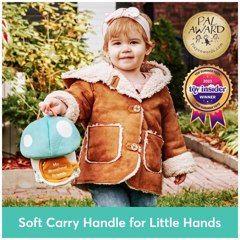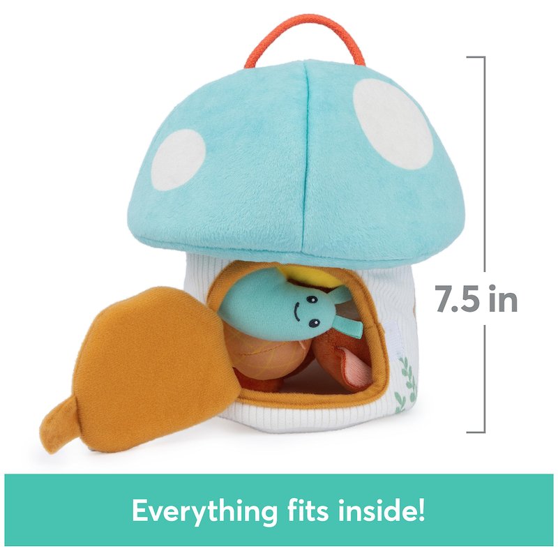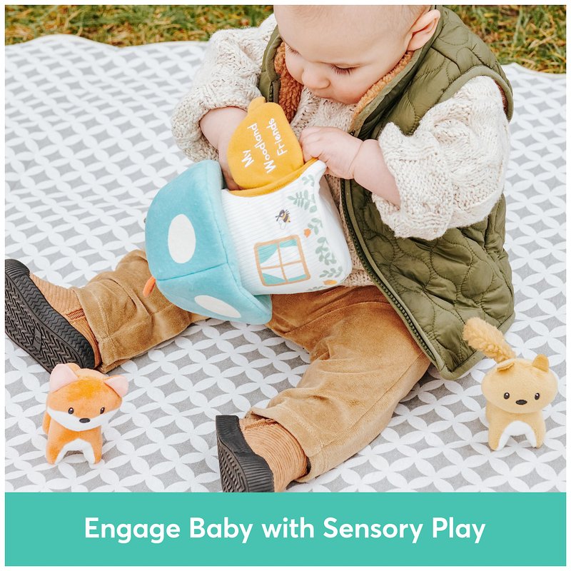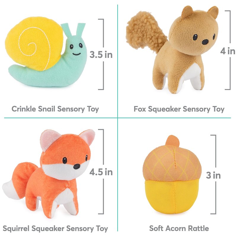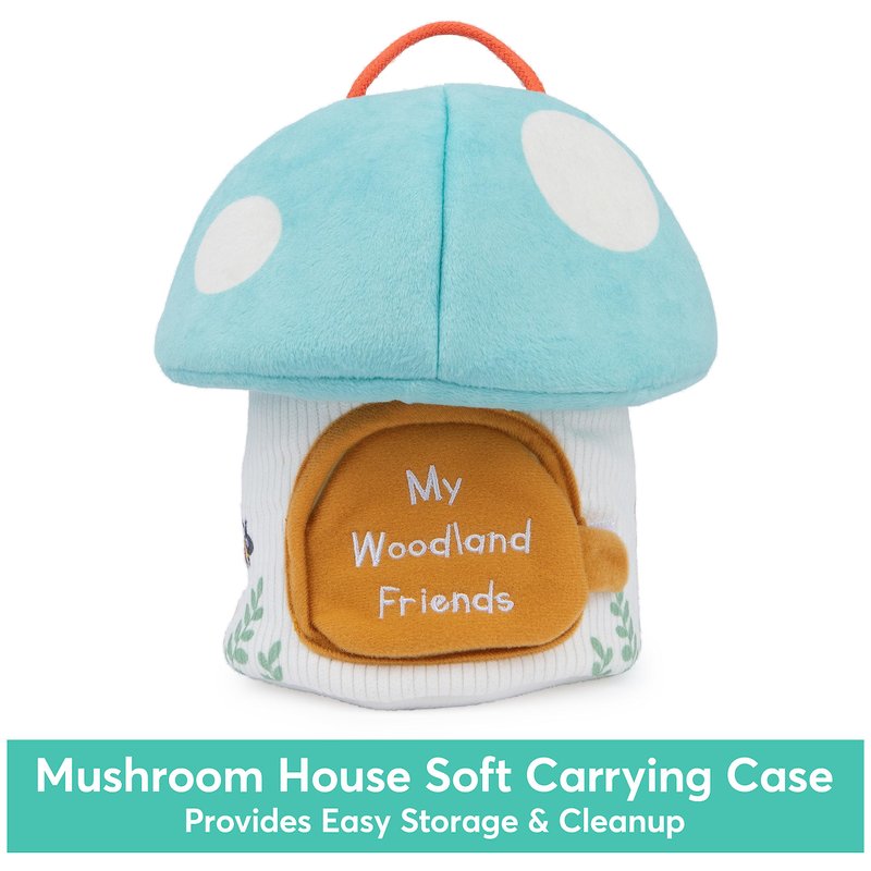 - PLUSH FOREST PLAYSET: This soft playset features a 7.5” teal mushroom house which stores 4 soft sensory toys: plush squirrel and fox squeakers, a crinkling snail, and an acorn rattle. Each sound toy is designed to stimulate and entertain baby!