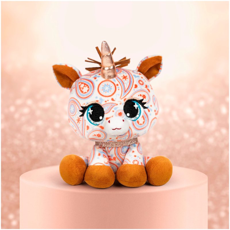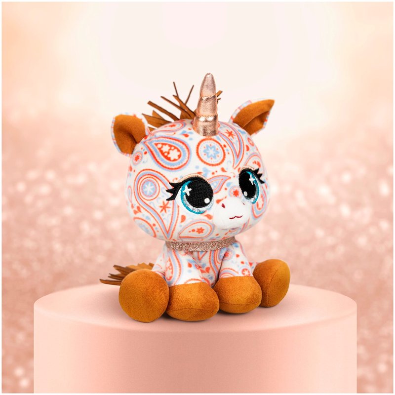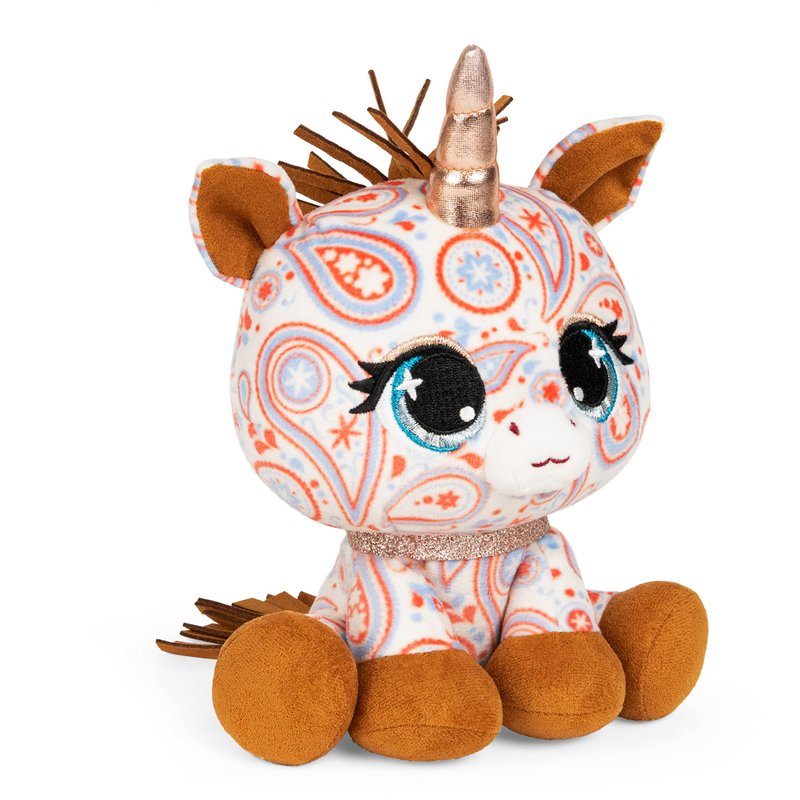 - DESIGNER FASHION PET: Free-spirited unicorn Sally Mustang is here for good vibes only! This earth-toned plush is pretty in paisley with suede hooves that are ready to kick up dust at the next festival. Her rose gold horn will lead the way through an excited crowd as her fierce fringe mane and tale flow in the wind.