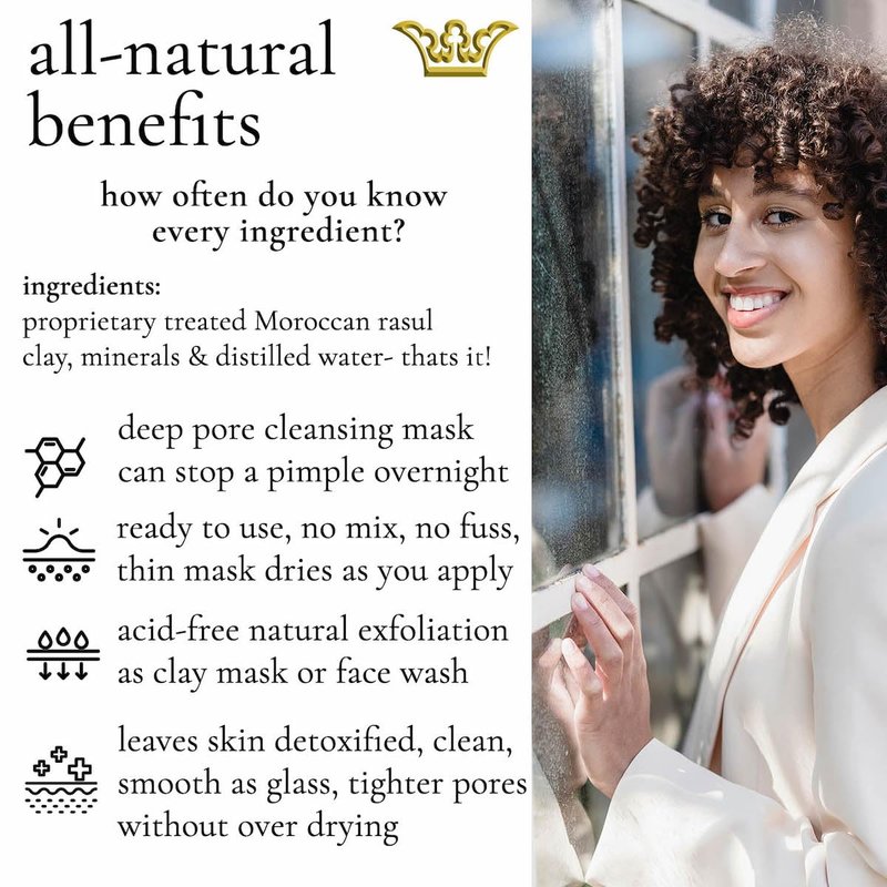 - 🌱 All Skin Types Unisex: Safe for all ages and skin types. Mask: Massage a Thin Translucent Like Layer Onto Damp Skin; should dry in 2-4 minutes; leave on for 5-30 minutes or overnight; remove with water. Do not apply a thick clay mask. Spot Treat: Dab clay on pimples, cysts, ingrown hairs, bug bit; leave on for 30 minutes or overnight. Repeat as needed. Always hydrate after a mask; use an oil-free aloe-based moisturizer like GUNILLA Hyaluronic Acid Serum or LEROSETT Moisture Matte.