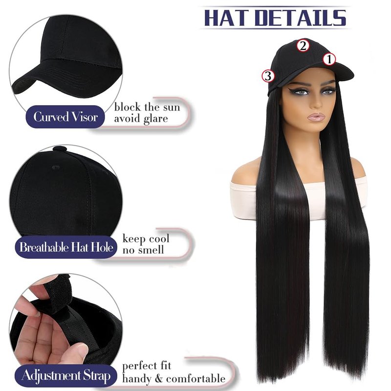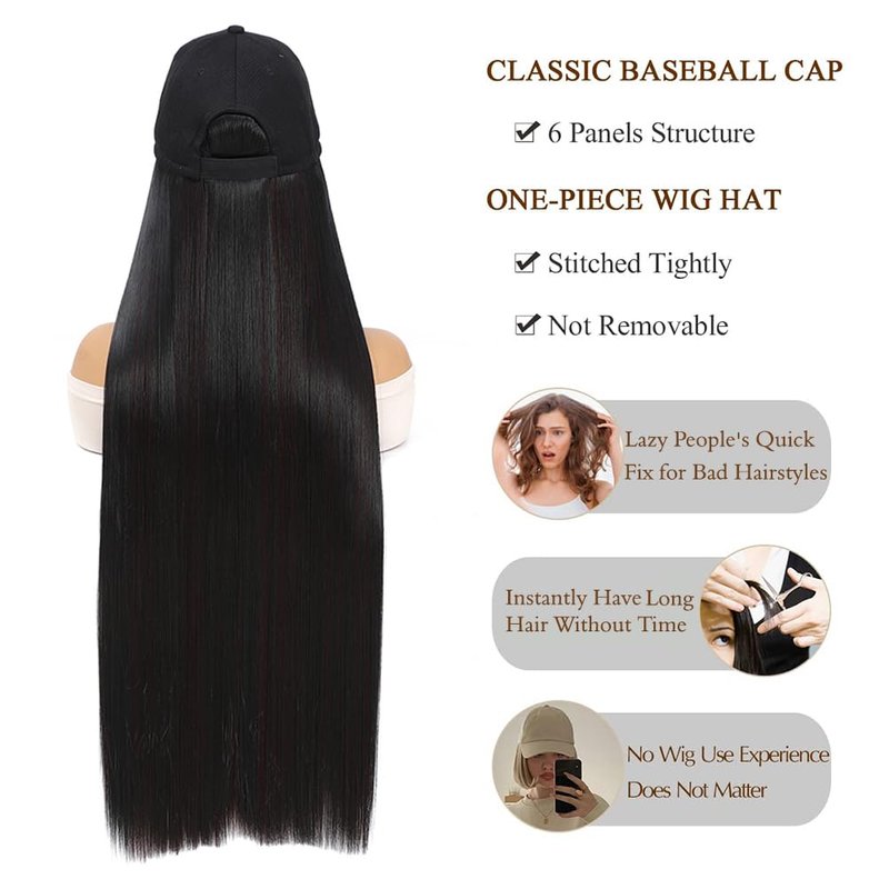 GUOJIAN Baseball Cap with Straight Hair Extensions 32inch Straight Long Hairstyle Adjustable Wig Hat Attached Synthetic Hairpiece for Woman (1B/99, 32Inch)