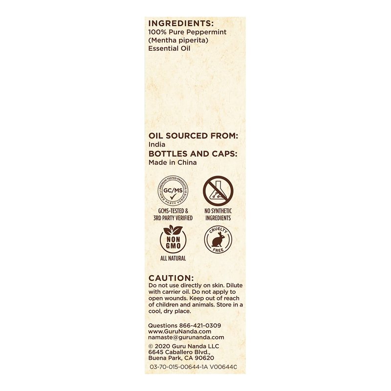 The invigorating scent of the peppermint leaves makes this essential oil a must-have wellness supplement. - Our peppermint essential oil is 100% pure, unadulterated, and natural. It is derived from the fresh leaves of Mentha Piperita by the process of steam distillation.- The incredibly reviving scent of natural peppermint leaves is historically believed to help lift your mood, support relief from headaches, and promote high energy levels- Add a few drops of peppermint oil to Gurunanda’s essential oil humidifier to create a spa-like fragrant environment in your bedroom or office. - Add the peppermint essential oil to your bath water. Simply use this oil before sleeping and you will come to love.- Mix 1 drop of our peppermint oil with 1⁄4 teaspoon of GuruNanda carrier oil (fractionated coconut oil or almond oil) in the palms of your hands. Then apply this mixture to the bottoms of your feet, the back of your neck or your spine to calm and refresh yourself.- We are committed to creating a wonderful aromatic experience for you. Learn more below:- This oil is tested by third-party experts for safety and is GCMS certified and ethically sourced from farmers. It is free from harmful chemicals and is processed under most hygienic conditions to ensure 100% purity.- It is packaged in an amber glass bottle with a leak-proof cap to keep it fresh and increase shelf life.