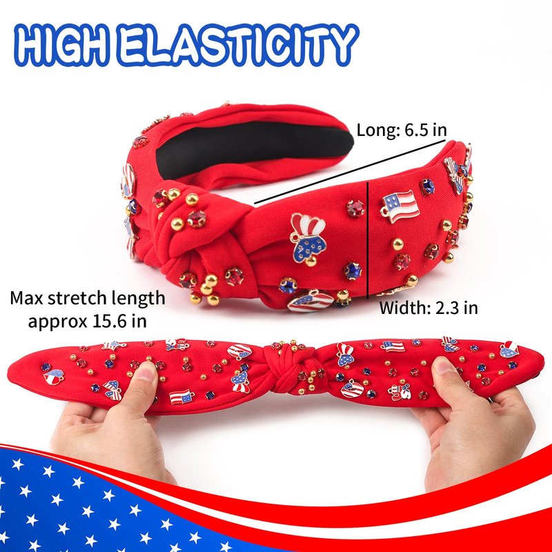 - ღ QUALITY MATERIALS: Our red america headband is a lasting tribute to the American Independence Day celebration and a symbol of your love for America. Made of premium fabric, gold beads, alloy hardware and crystals, it is lightweight, comfortable and flexible. Measures approximately 5.1 x 6.5 inches. Simple and understated yet delicate and gorgeous, it can emphasize your elegant taste and attract attention.