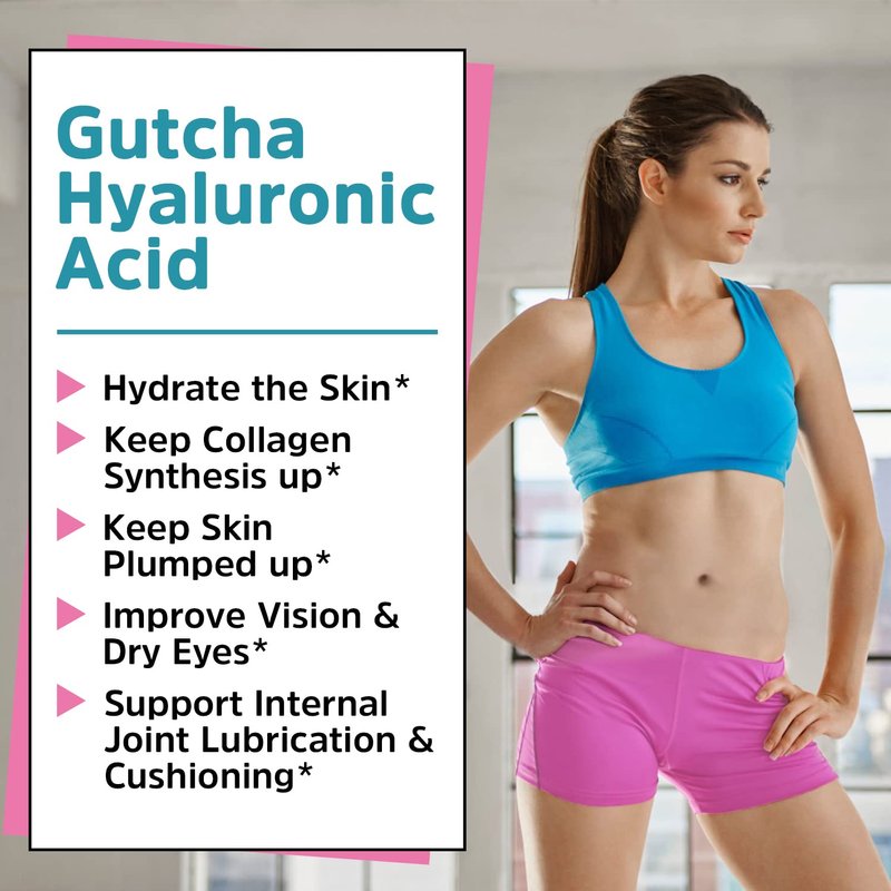 - Say Goodbye to Creaky Joints*!: Different from hyaluronic acid creams that only support your external skin elasticity, our hydrating hero also supports internal joint lubrication and cushioning*. Hyaluronic acid is a naturally-occurring constituent of joint fluid, which can bind water (almost 1000x its weight) to collagen*. Gutcha Hyaluronic Acid fortified with vitamin C provides the fluid matrix and acts as a shock absorber & lubrication agent within your joints to promote mobility*.