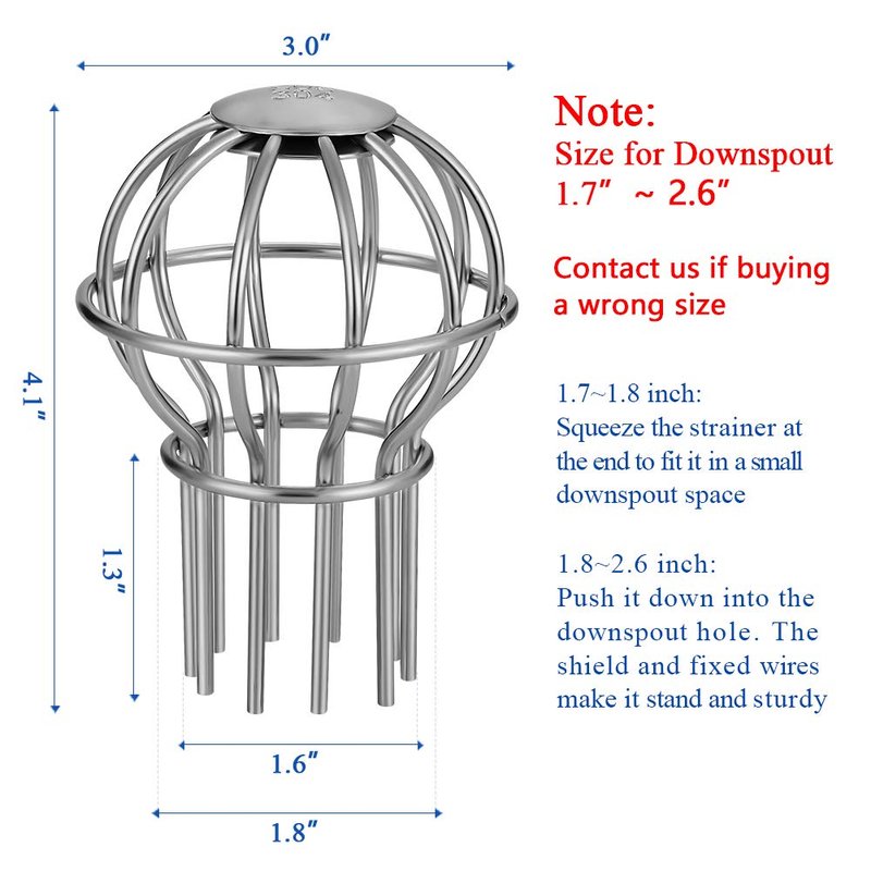 - EFFECTIVE STRUCTURE: This design works well for needles. Spherical shield head, flow-direction slot gap make leaves stop around, dirty and needles go into the tube. The size can be applied to holes of 1.7” to 2.6”. It’s also one of the most beautiful gutter guard strainer in appearance.