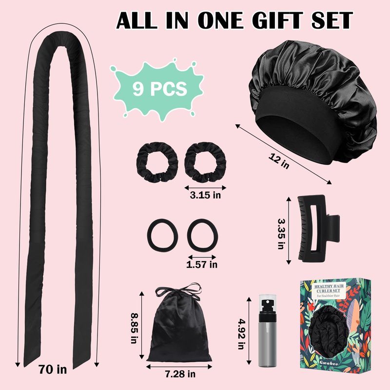 - THOUGHTFUL SET FOR WOMEN: Our heatless curling set includes 9 items: 1 x 70-inch long satin curling rod headband, 1 x satin hair bonnet for sleep, 1 x hair clip, 2 x satin hair ties, 2 x elastic hair ties, 1 x satin storage bag, and 1 x spray bottle. This all-in-one curling rods set is packaged in an exquisite box, making it the perfect present for your wife, mother, daughter, friends, or colleagues.