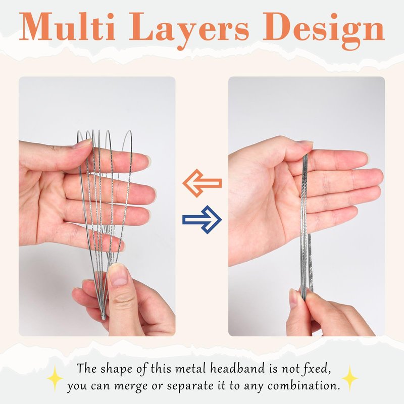 - Multi Layers Headbands - This elegant headband is made of shiny metal, with each headband consisting of 6 thin pieces of metal. You can separate them at different intervals or combine them according to your needs or preferences, to create different shapes.