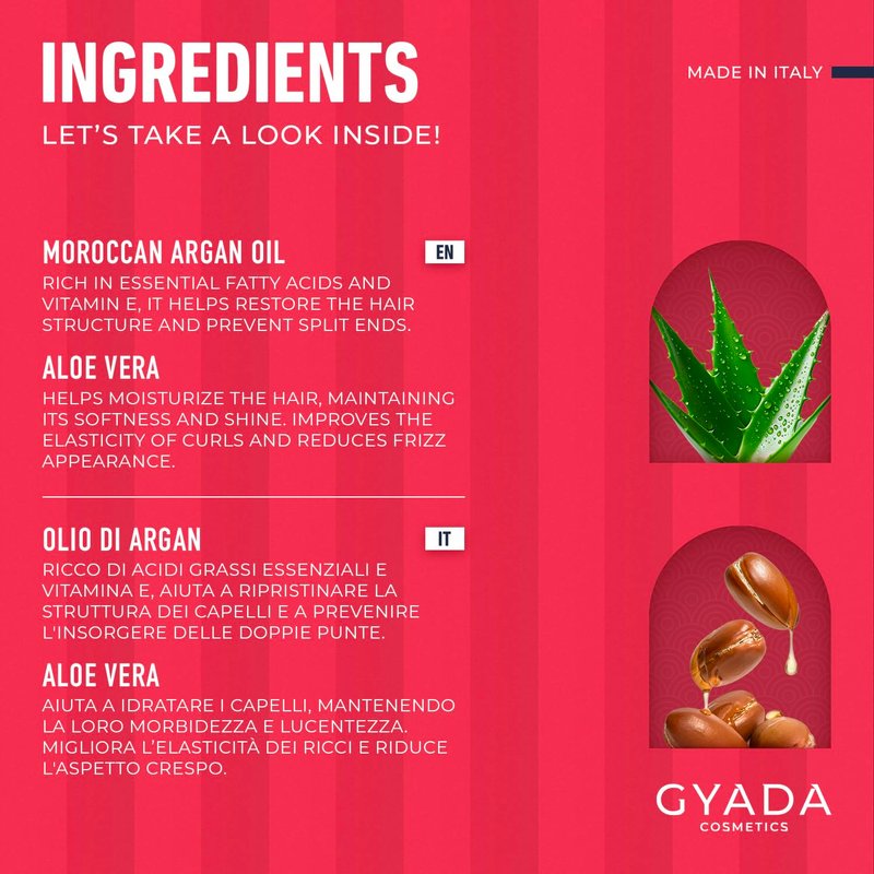 - INGREDIENTS: Formulated with fine vegetable oils (Flaxseed, Coconut, Argan, and Jojoba) that help restructure and nourish the hair, Shea Butter, and Aloe Gel, with protective and anti-frizz effects.