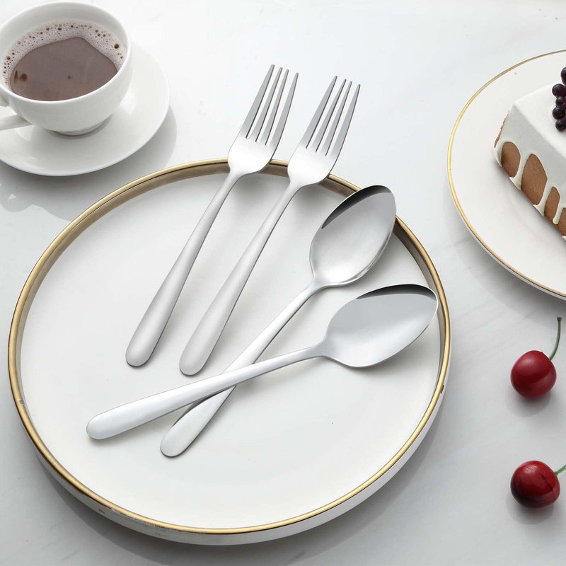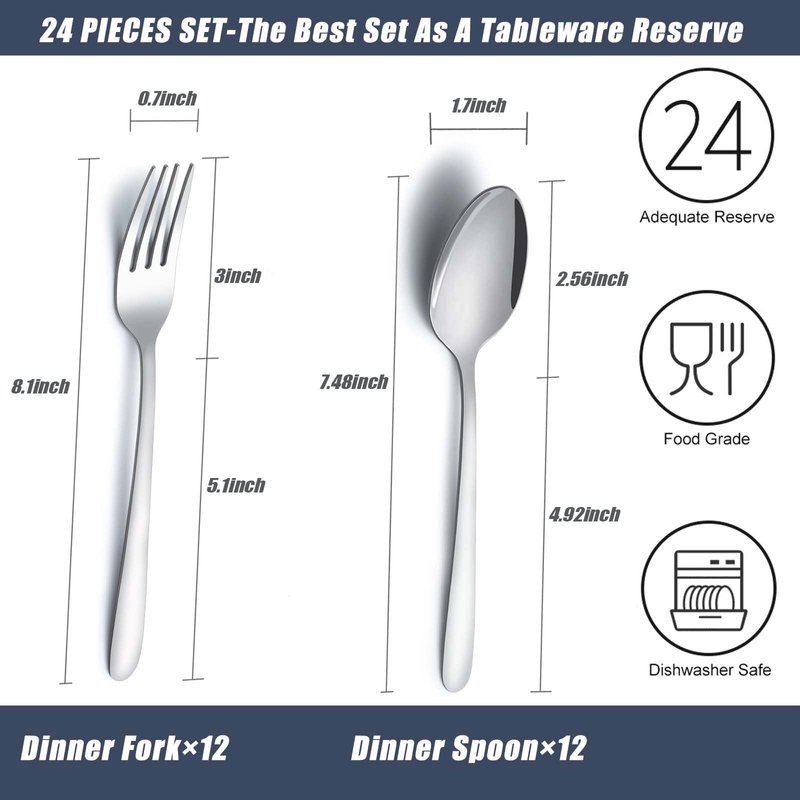 This fork and spoon cutlery set includes 12 dinner forks and 12 dinner spoons, which helps you replenish your tableware when you find that the cutlery set is missing forks or spoons.These forks and spoons silverware are made of food grade stainless steel, which is rust-resistant, sturdy and will not produce residues or odors to ensure your health. What's more, the 24 piece spoon and fork set is made by more advanced crafts, which is more durable to make sure that it will be used for many years. More importantly, different from the other metal spoons and forks, this kitchen spoons and forks set is made with a more advanced craftsmanship, thus enhancing its durability and sturdiness. If you are looking for silverware forks and spoons only, this is what you need.Last but not least,this spoons and forks stainless steel is dishwasher safe,which can save your labor
