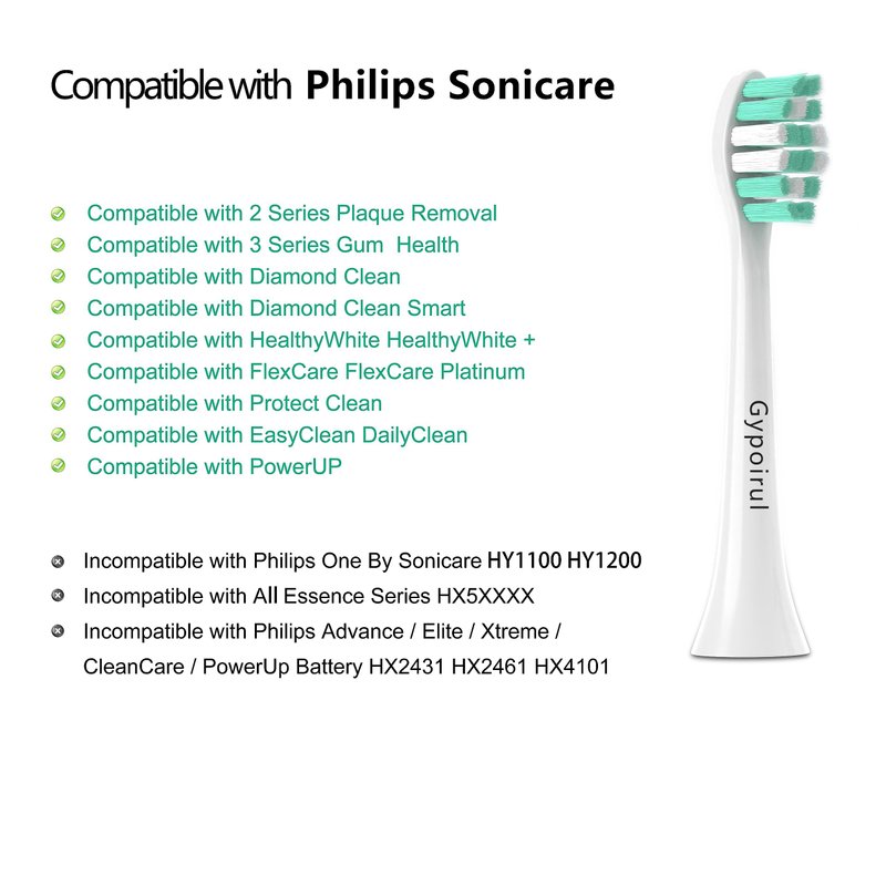 - HIGH COMPATIBILITY: Gypoirul toothbrush heads Compatible with sonicare replacement heads Snap-on system. Compatible with 2 Series Plaque Control 3 Series Gum Health HealthyWhite DiamondClean ProtectiveClean EasyClean DailyClean FlexCare ExpertClean PowerUp Elite+ toothbrush handles.