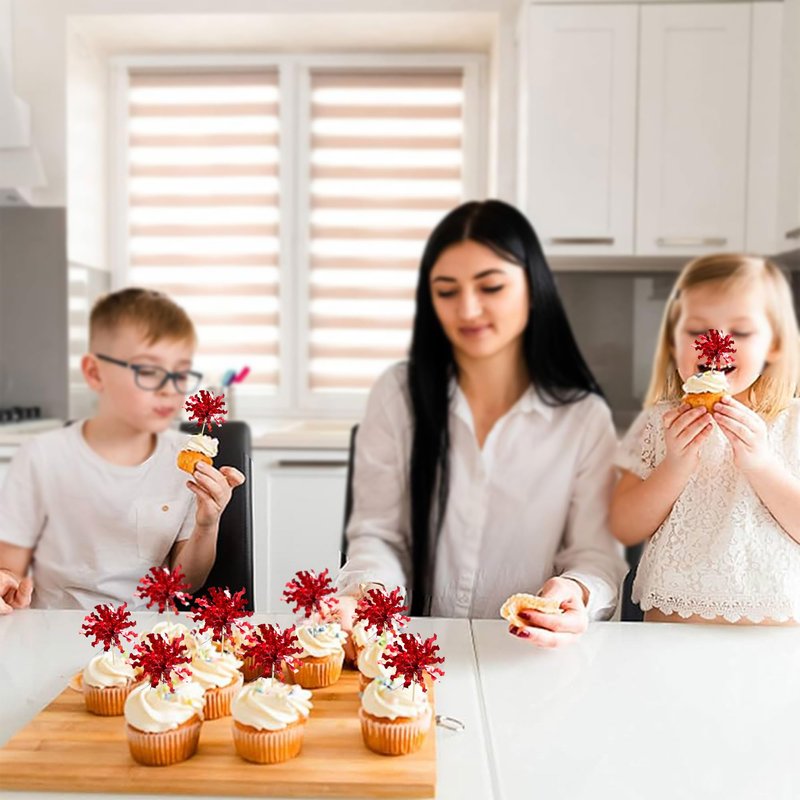 Gyufise 20Pcs Foil Firework Cupcake Toppers Sparkle Tinsel Cake Toppers Tinsel Drink Cake Decoration Cocktail Picks for Birthday Wedding Graduation Party Supplies Red