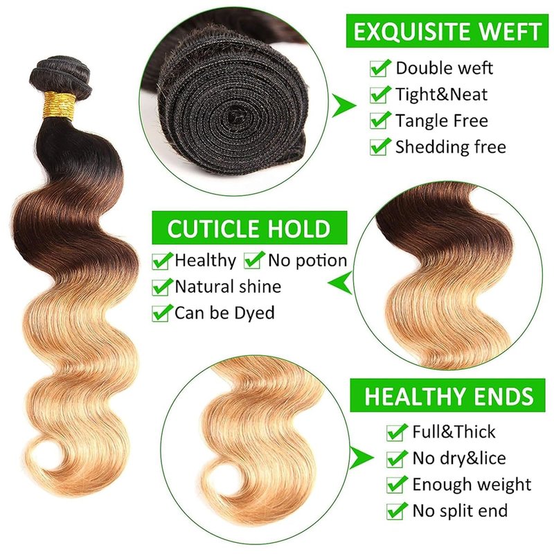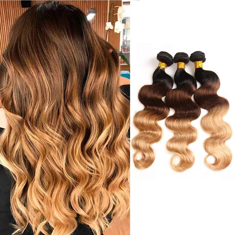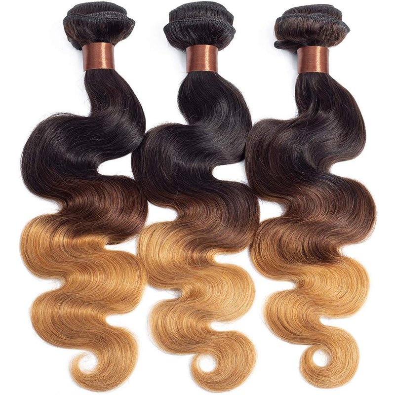 Why choose us?(1).Our bundle is 100% human hair, good quality, Soft and thick, no tangling, no shedding,clean, natural, comb easily, easy to wash and care, no synthetic or animal hair.(2).We use virgin hair cut from young girl head directly instead of collecting from floor.(3).The company has more than 20 years of hair production experience, understands customer needs, and provides wholesale sales. About hair bundle Material:100% unprocessed virgin hair.Quality:Brazilian remy hair,no shedding,no tangle.Color:T1B/4/27 Color,Three tone hair bundle.Size:8--30 inch in stock.Weight:100g/Bundle,a pack three bundles 300g.Style:Can be curled,but please note that the temperature does not exceed 180 ℉,otherwise it will destroy the hair structure.FQA:Q:How many bundles do i need for a full head?A:Generally speaking 3 bundles can be satisfied.