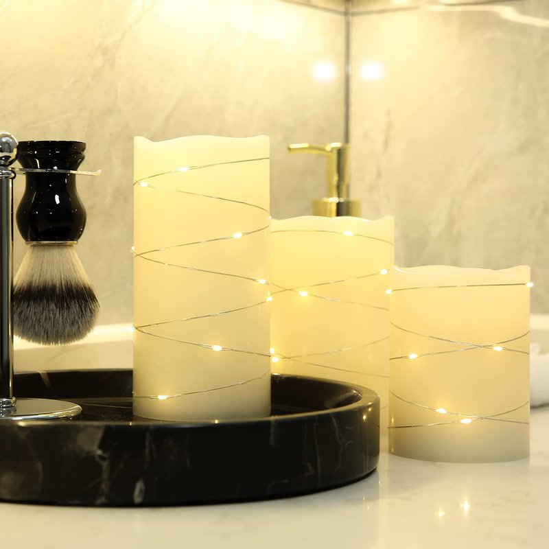 - EMBEDDED STRING LIGHTS: Each candle is wrapped in silver wire string lights to provide small but bright points of light and a one-of-a-kind captivating look.