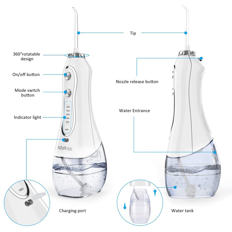 H2ofloss Water Flosser Portable Dental Oral Irrigator with 5 Modes, 6 Replaceable Jet Tips, Rechargeable Waterproof Teeth Cleaner for Home and Travel -300ml Detachable Reservoir (HF-6)