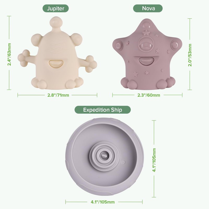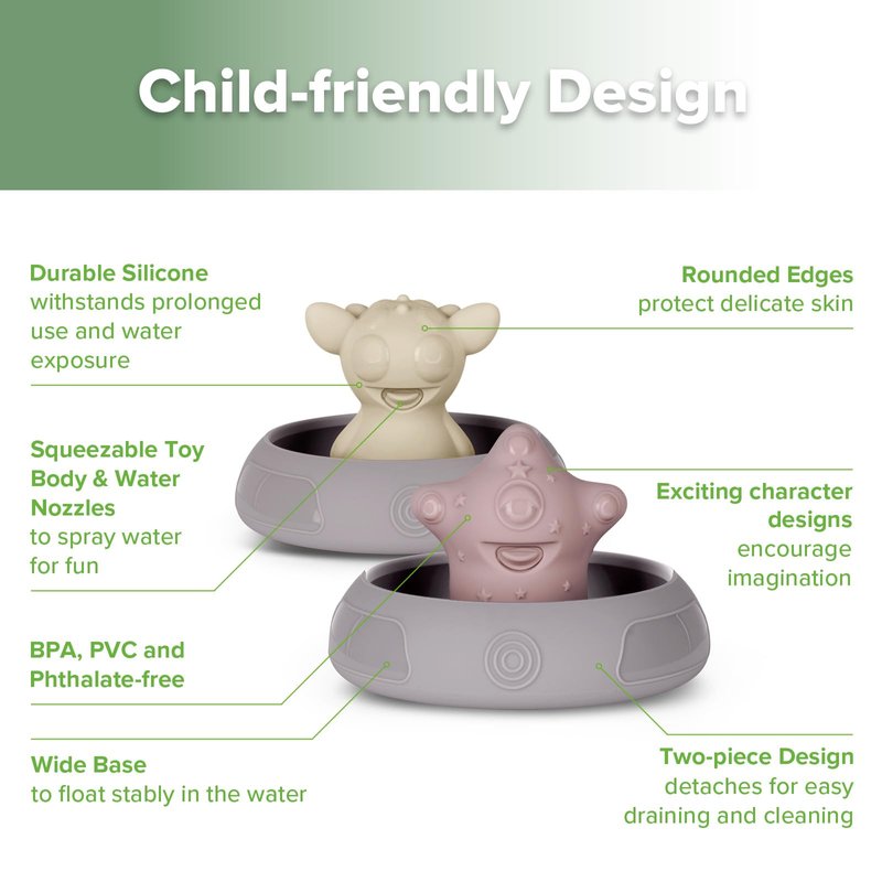 Get ready to meet the Alien Explorers! This adorable toddler bath toys set is designed to pull apart for easy draining, cleaning and drying! And because they're made of soft, non-toxic food-grade silicone, each tub toy is safe on your baby's skin and in the water.Crew members Tympani, Nova,Jupiter, Bumble and Dux, along with their ship, the Constellation Express, are perfectly sized to let little hands spray water with a simple squeeze for endless entertainment. In the bath, the pool, at the beach or just as an everyday toy, this set is truly magical!