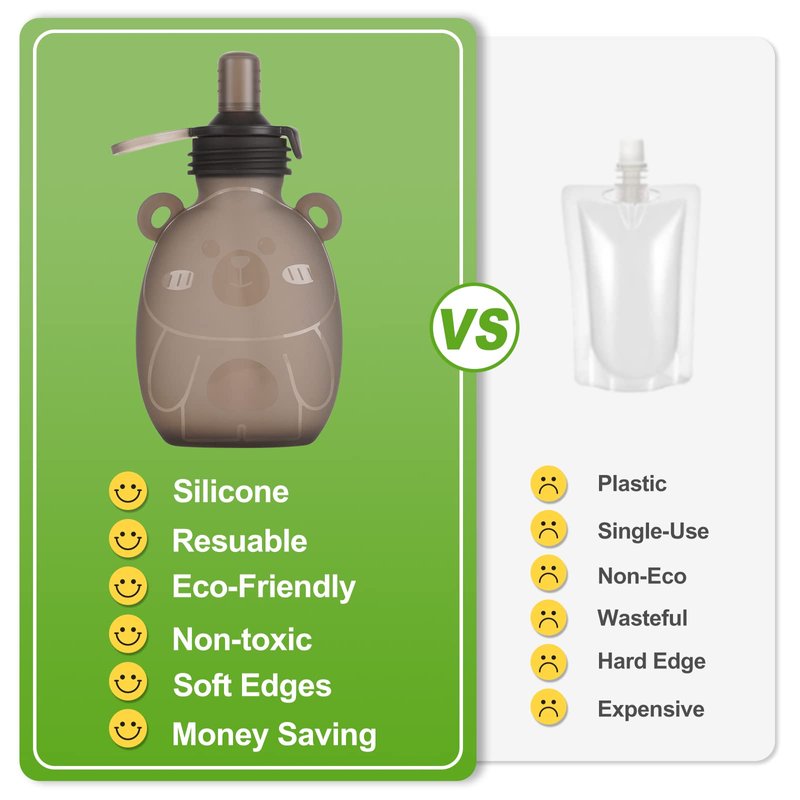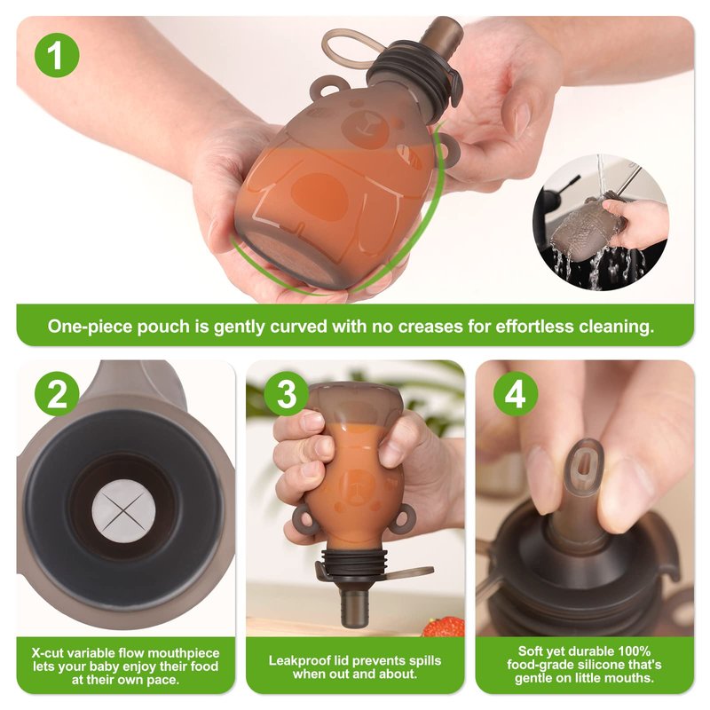 - 𝐍𝐄𝐖𝐋𝐘 𝐔𝐏𝐆𝐑𝐀𝐃𝐄𝐃 𝐃𝐄𝐒𝐈𝐆𝐍:The adorable bear-shaped pouch body is sure to capture your baby's attention and make them fall in love with it. Plus, the one-piece pouch makes cleaning a breeze.
