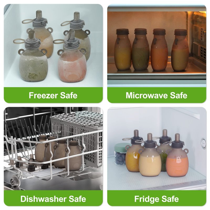 - 𝐒𝐀𝐅𝐄:Thanks to their high-quality food-grade silicone material, our reusable baby food pouches are ideal for storing both hot and cold foods. They are heat and freeze resistant, able to withstand temperatures ranging from -20°C to 230°C. Moreover, when you freeze or heat your food in our pouches, you can rest assured that there are no toxins or microplastics that will leach into your food.