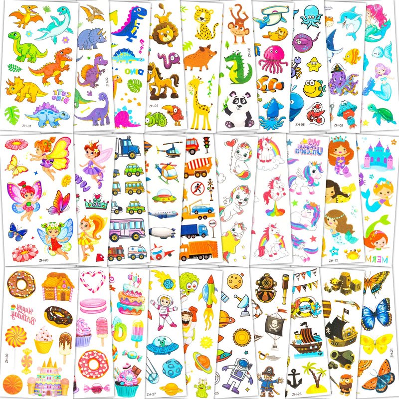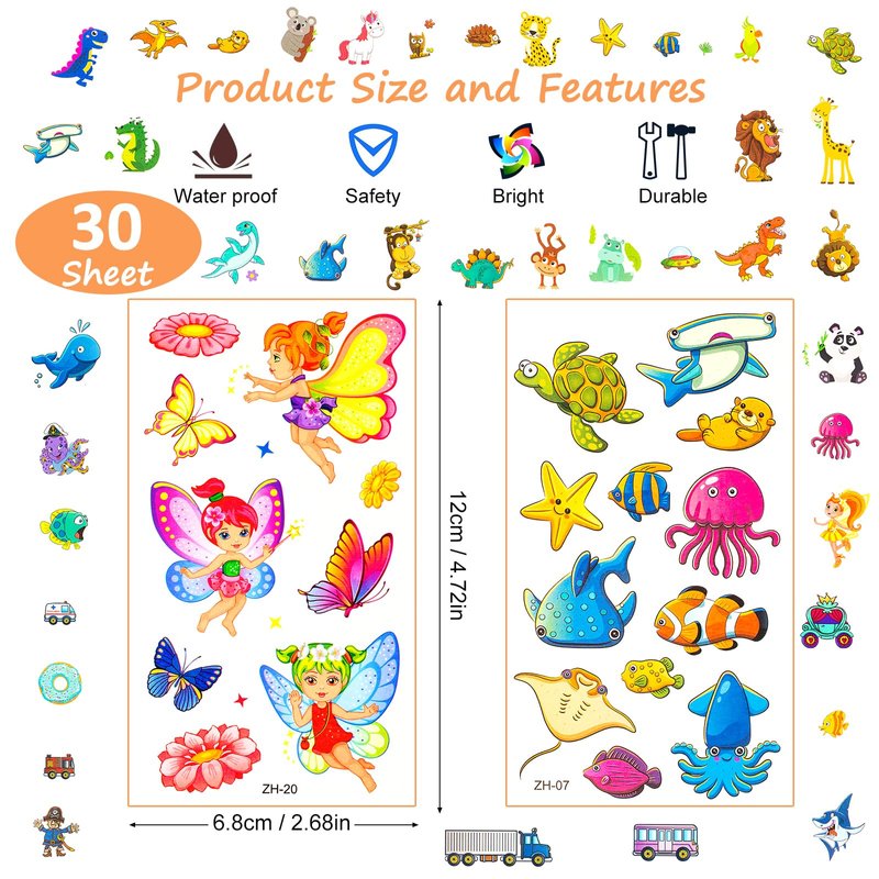- 🦋 Variety of tattoos stickers for kids: 300+ kids tattoos set. Temporary tattoos include space, dinosaurs, animals, butterfly, fish, car,candy etc. The rich content provides hours of creative fun and subtly influences children's imagination and creativity.