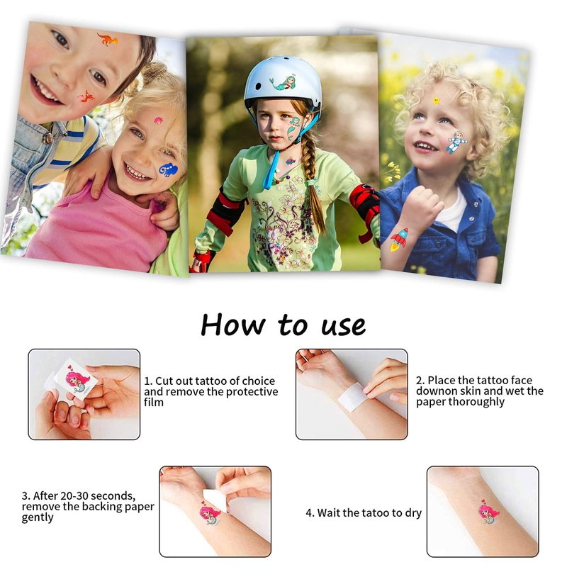 - Durable, Waterproof and Easy to Use and Remove: Temporary kids tattoos sticker last long for 3-5 days, depends on how often the tattoo is scrubbed with soap and water. They can easily peel and glue and leave no traces. It can also be easily removed with olive oil or soap