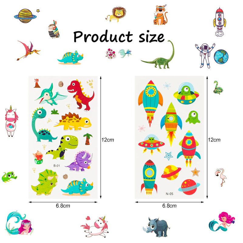 - Variety of tattoos stickers for kids: 60 Sheets kids tattoos set. Temporary tattoos include space, dinosaurs, animals etc. The rich content provides hours of creative fun and subtly influences children's imagination and creativity
