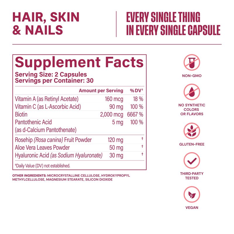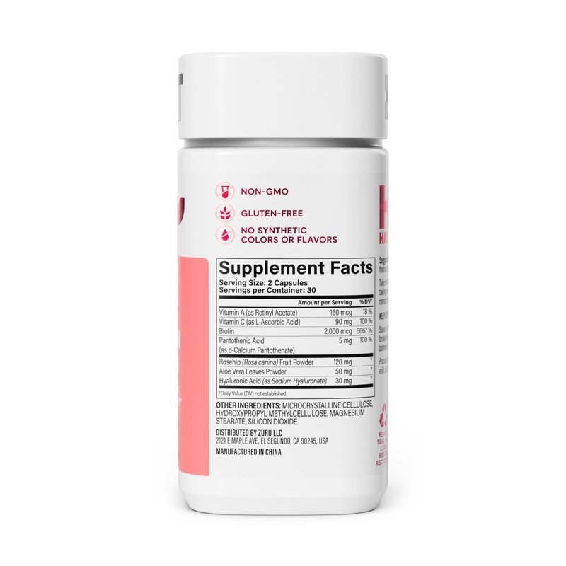 - WHAT’S INSIDE: A 2000mcg daily dose of Biotin, Vitamin A and Vitamin C, plus a skin-brightening blend of Hyaluronic Acid, Rosehip and Aloe Vera.